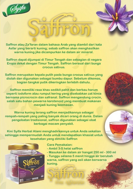 Saffron yang kami jual adalah 100 original saffron murni sudah bersertifikat memiliki izin edar dan teruji laboratorium untuk keasliannya dan kualitasnya. Bunga saffron merupakan jenis bunga yang dikenal sejak dahulu akan khasiatnya.
