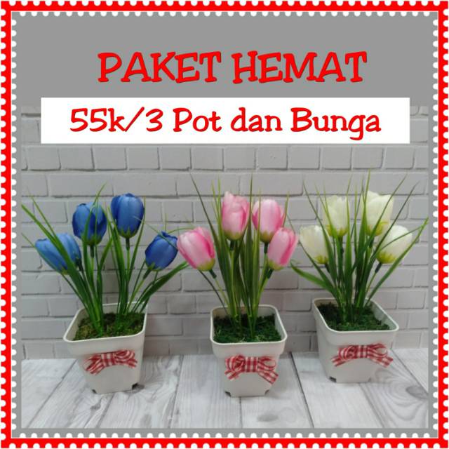 Dapat 3 55k 3 Pot Dan Bunga Artificial Bunga Tulip Dekorasi Shabby Chic
