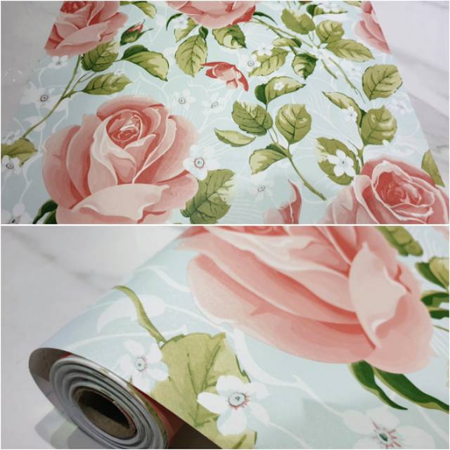 Grosir Termurah Wallpaper Sticker Dinding Putih Bunga Mawar Pink Berdaun 10 M