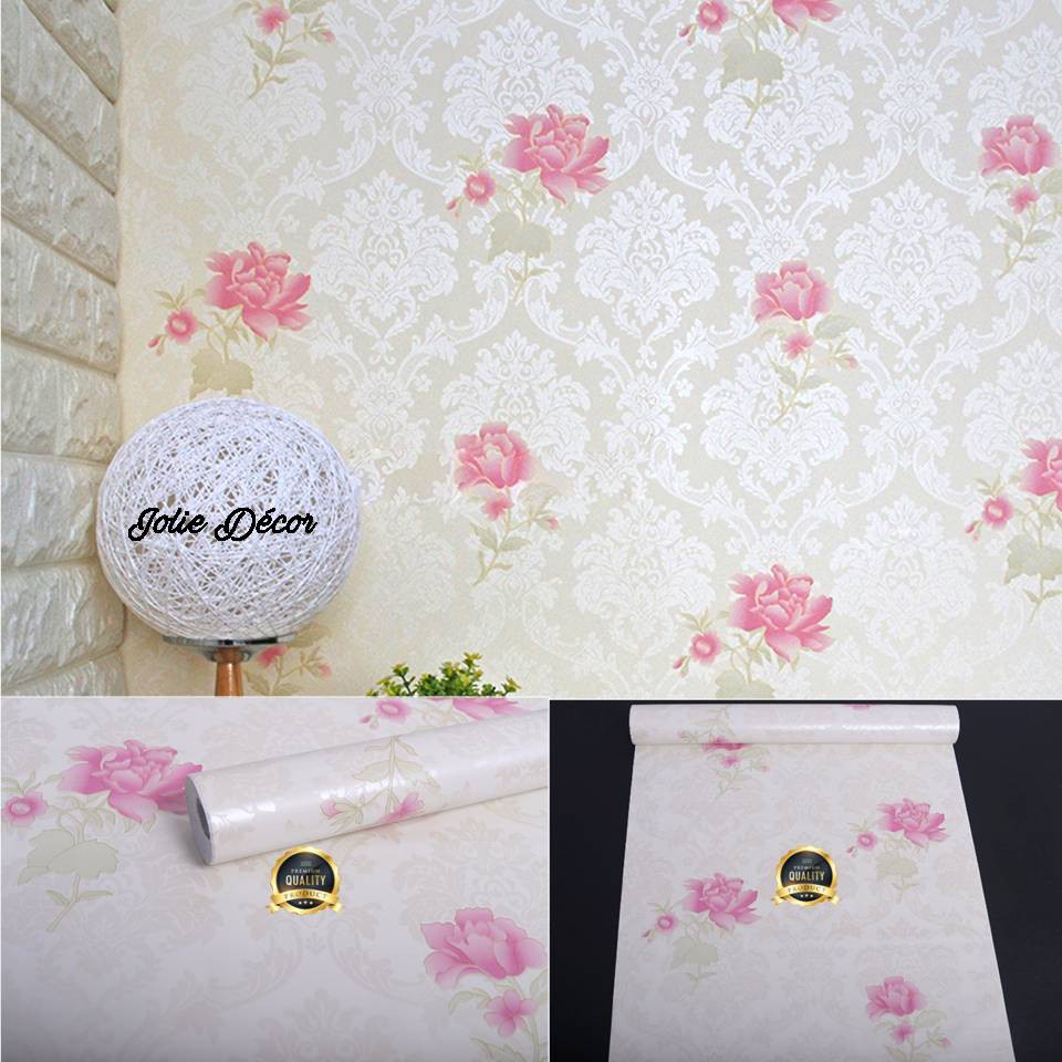 Grosir Murah Wallpaper Sticker Dinding Indah Bagus Cantik Modern Elegan Cream Bunga Pink