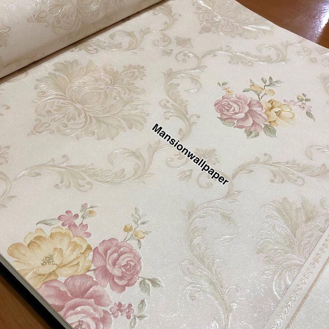 Wallpaper Dinding Klasik Soft Cream Biru Bunga Pink Kuning Order Yukkk