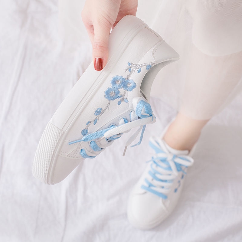 Sepatu Sneakers Wanita Motif Bordir Bunga Plum Warna Putih Untuk Musim Semi Gugur
