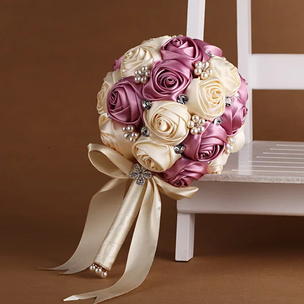 Us 16 77 45 Off Sweety Pink Hot Pink Gading Satin Rose Stitch Karangan Bunga Kustom Pita Mutiara Kristal Buket Pengantin Pernikahan Bunga Kustom