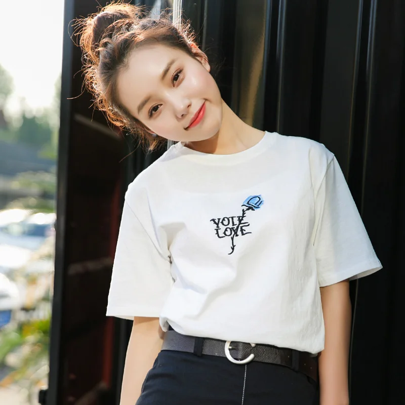 2017 Wanita Jepang Harajuku Ulzzang Surat Bunga Bordir Katun