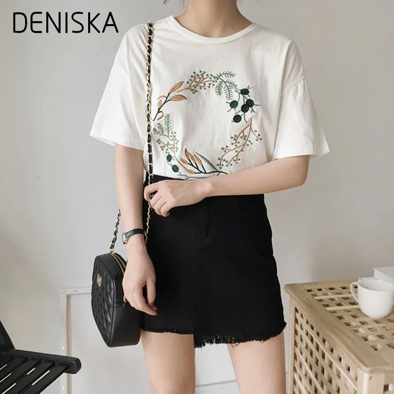 Korea Padat Bunga Bordir Elegan Katun T Shirt Wanita