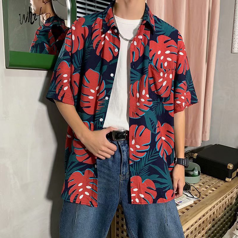 Versi Korea Dari Ulzzang Lengan Pendek Kemeja Pria Port Angin Retro Chic Longgar Hawaii Kemeja Bunga