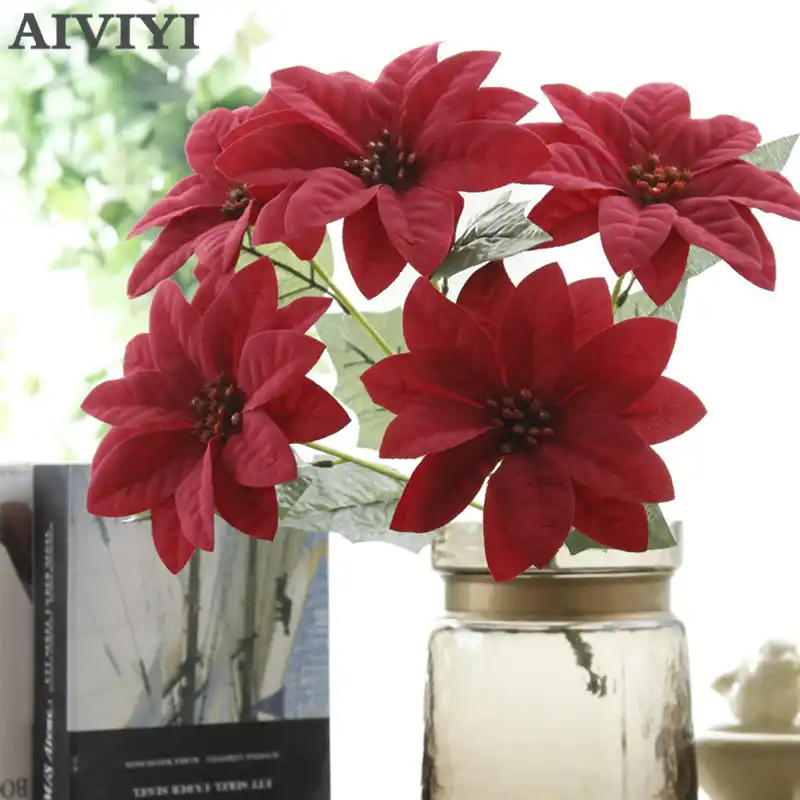 Sentuhan Nyata Flanel Buatan Natal Bunga Merah Poinsettia