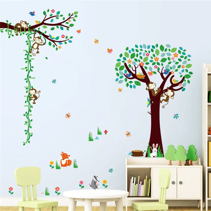 Us 4 25 22 Off 3 Gaya Modern Kartun Anak Ketinggian Mengukur Stiker Dinding Hijau Pohon Tanaman Merambat Cabang Monyet Burung Bunga Kupu Kupu
